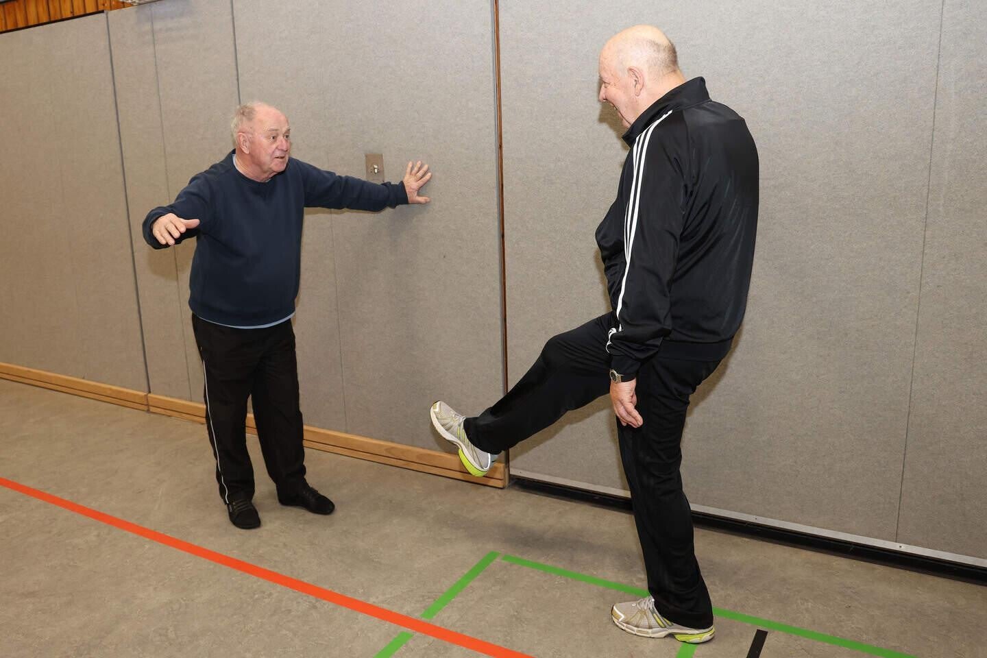Zu alt für ein bisschen Bewegung ist man nie. Das beweisen auch die beiden Herren Ü80 im Kurs. Sich dabei an die Hallenwand anzulehnen, ist ausdrücklich erlaubt. Foto: Anna Petra Thomas